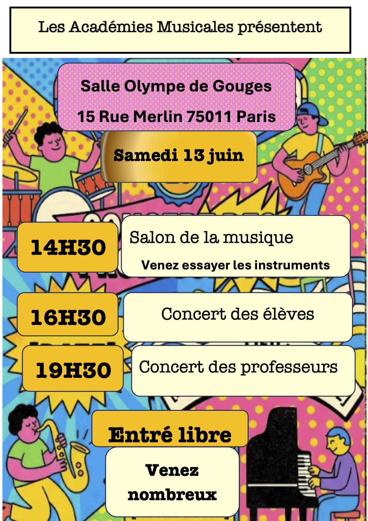 Des cours, des ateliers : guitare, piano, saxo, violon, accordéon, flûte,solfège, dessin, peinture, marrionnettes, théâtre à l'Académie Inter Musicale de Paris AIMP et dans les Académies Musicales des 5ème Monge, 11ème Bastille ou Voltaire, 13ème Italie ou Glacière, 14ème Plaisance et 15ème Convention ou Lourmel.